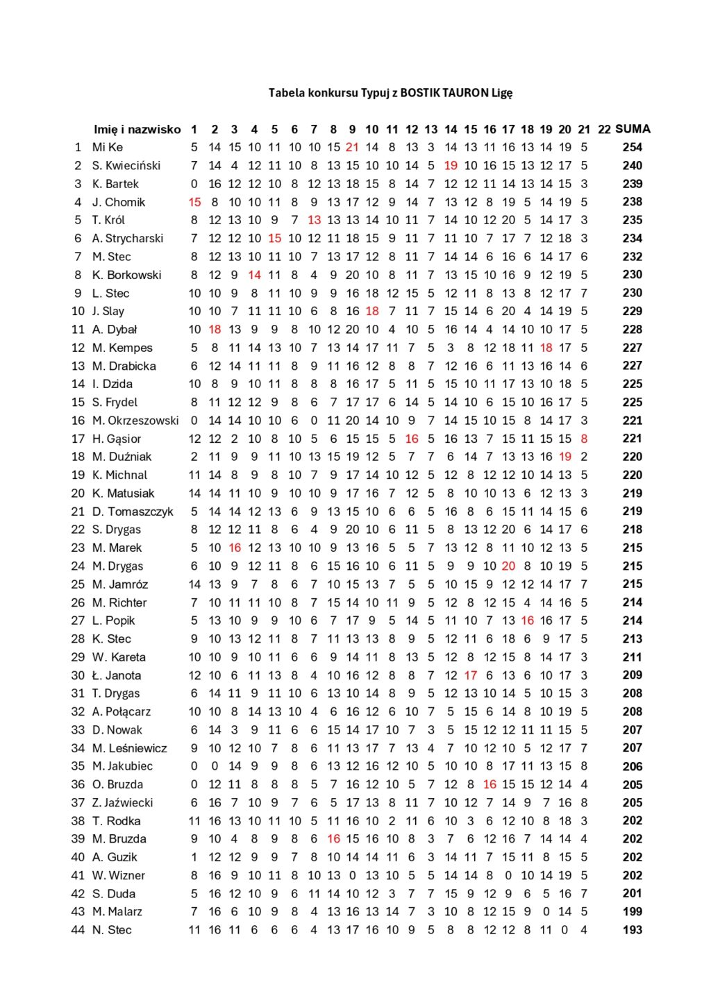 Tabele dotyczące danej kolejki będą ukazywać się systematycznie na stronie www.bkssa.pl. Każdy z uczestników będzie miał 24 godziny na sprawdzenie wyników i ewentualne zgłoszenie błędu.